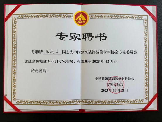 正是憑借著自己的專業知識和豐富經驗,王戰立先生在今年3月舉辦的全國建筑涂料行業年會暨全國建筑涂裝職業技能大賽總決賽上,被《中國建材報》聘請為“中國建材報涂料行業智庫專家”。這份聘書不僅是對王戰立先生過去在培養技能人才和推動行業發展方面所作出貢獻的認可和肯定,更是對他未來工作的期望和信任。