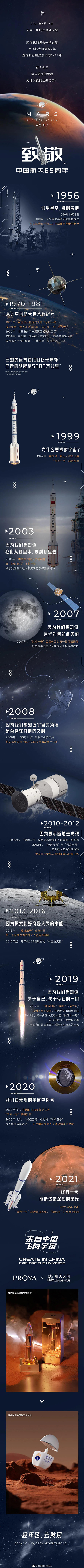 在對浩瀚宇宙65年的探索過程中,中國航天實現了從一窮二白到輝煌成就的巨大跨步。從1956年中國第一個火箭與導彈研究機構成立,到2021年“天問一號”成功著陸火星,中國航天一次又一次打破全世界的認知,證明了中國的硬實力,向世界宣告:我們“來自中國 飛向宇宙”。