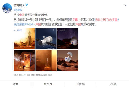 值“天問一號”著陸之際,中國美妝品牌珀萊雅正式宣布與中國航天跨界聯名,發布長圖回顧中國航天65年輝煌歷程,同時推出“雙抗精華中國航天珍藏款”與“羽感防曬中國航天定制款”產品,致敬中國航天。