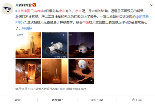 隨著聯名活動的推出,不少網友表示,“這個創意太棒了吧!又浪漫,又有創意!”、“看到珀萊雅和航天文創的聯名之作,竟然有點感動和瘋狂心動,我們大家一起致敬中國航天!”、“一直以來都熱衷去發現的珀萊雅這次把航天元素融進了護膚美學,聯合中國航天文創推出的創意之作可以說非常用心了?!本W友紛紛成為"自來水",為品牌創意和品牌態度打call。