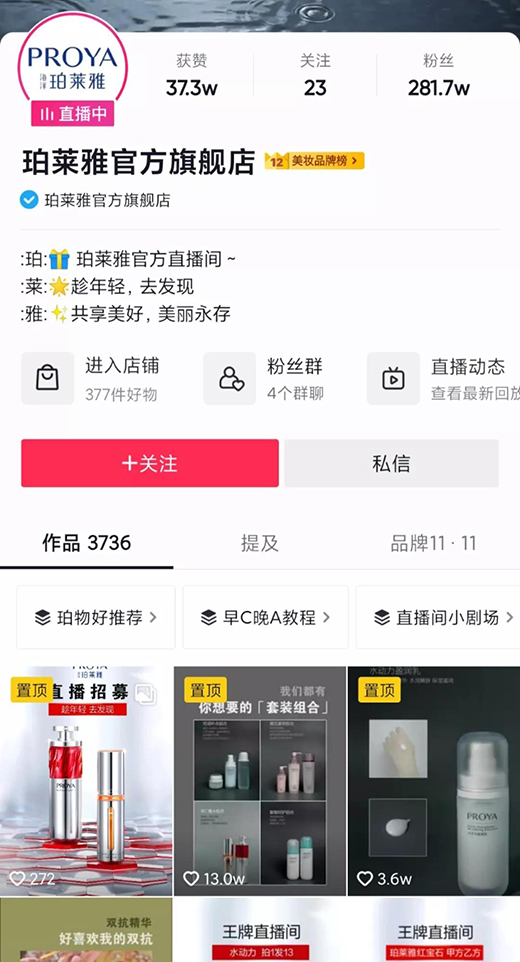 當其他品牌仍在猶豫是否開啟自播時,珀萊雅官方賬號在抖音平臺已坐擁百萬粉絲。