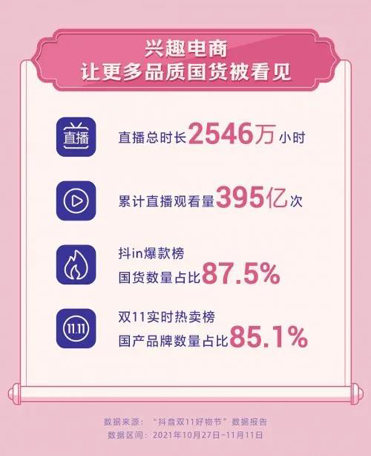 其中,抖音雙11好物節(jié)期間(10月27日-11月11日),商家自播總時(shí)長達(dá)1227萬小時(shí),總體累計(jì)看播人次395億,品牌成交額破千萬(含破億)的品牌達(dá)577個(gè),單場(chǎng)成交額破千萬(含破億)直播間282個(gè)。