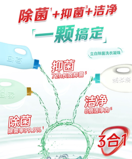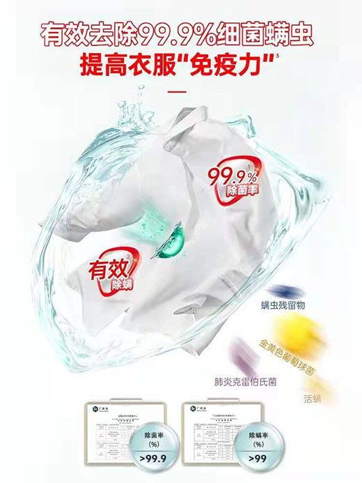 我們每天接觸外界,穿的衣服上其實有很多看不見的細菌,這是很正常的,但是長期下來可能會形成病菌隱患,危害我們的健康。比如出現交叉污染產生異味;細菌滋生、螨蟲附著等導致皮膚過敏的問題,因此,衣物也是需要“提高免疫力“的,干凈是基礎,除菌也很重要。立白除菌洗衣凝珠的除菌率高達99.9%,能夠有效幫助袪除細菌和螨蟲,而且長效抑菌多達72小時,衣服即使陰干也可以像在日光下晾曬一樣清新。