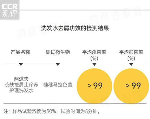 《消費者報道》檢測了阿道夫茶麩祛屑止癢養護理洗發水對糠秕馬拉色菌的殺菌、抑菌性能,以判斷其去屑功效。結合消費者日常使用情況,將此次試驗的樣品濃度設定為50%、試驗時間為5分鐘。