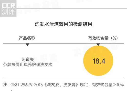 檢測結果顯示,阿道夫茶麩祛屑止癢養護理洗發水有效物含量為18.4%,說明該款洗發水的清潔效果較佳。