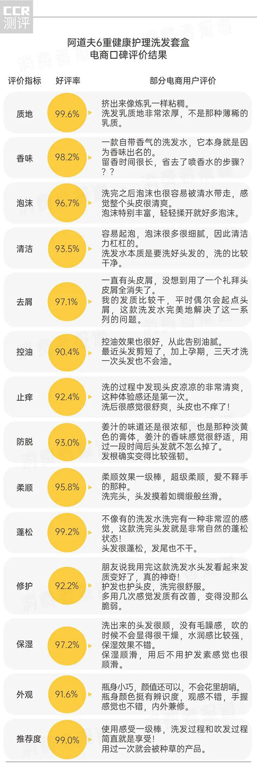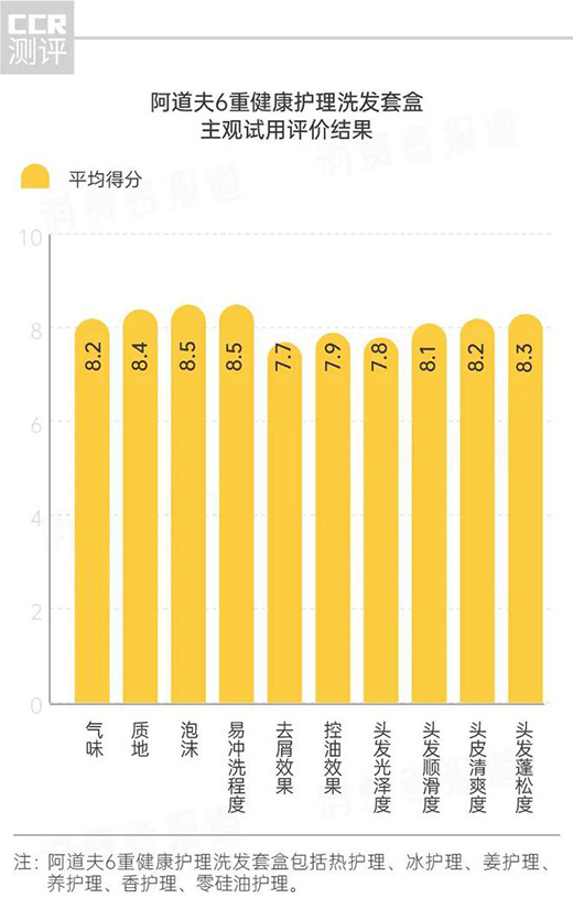 2021年1月,《消費者報道》對這款顛覆傳統洗護方案的阿道夫6重健康護理洗發套盒進行多維度評價。隨機將其中一種洗發水送至第三方權威檢測機構,測試其去屑功效、清潔效果、溫和性指標。