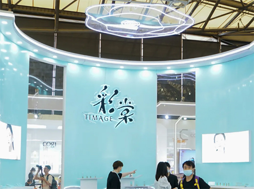 以彩棠為例,其展位以獨特的青色為基調(diào),將遠山淡影淡淡勾勒,表現(xiàn)出「留白」式的中國審美,意境幽遠,靈動有致,匠心獨具。