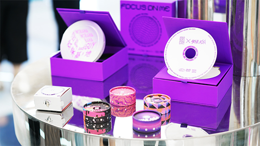 INSBAHA則圍繞“唱片”概念,將展區(qū)劃分為三個功能區(qū)域,聯(lián)名區(qū)、爆品區(qū)、用戶體驗區(qū)。同時,中心圓設計仿照唱片的形式與唱片腮紅的設計理念呼應,地板上的燈帶仿照唱片的紋路打造,極具動態(tài)感。發(fā)光的柱體上鑲嵌著INSBAHA的slogan“FOCUS ON ME”,表達了“焦點是我”的品牌態(tài)度。