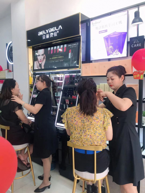 做顏值生意,當然要有高顏值空間,百黛天嬌首先在裝修設計上做了創新,通過大面積試用區域、明亮愉悅色彩、無導購銷售模式的運用,打造開放式購物場景,讓消費者輕松自如邊試邊逛。