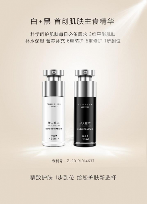 伊人唯本把復雜的東西簡單化,把繁瑣的過程便捷化,用科技帶領時尚,讓護膚變得便捷、高效!其主要的產品白+黑精華就是這樣一瓶致勝的精華!白瓶白天使用,主打補水保濕,6重防護,日常抵御外界污染間接損傷皮膚;黑瓶晚間修護,維穩強韌肌膚,黑白聯合作用,不僅保證日常肌膚基本營養,還能進一步增強肌膚屏障,維穩抗老。