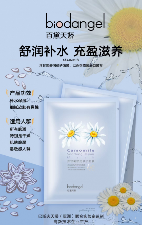 不僅僅能夠深層清潔,還可以快速滲透補水,解決皮膚缺水問題,令肌膚水潤彈滑。洋甘菊舒潤修護面膜這款面膜選用以色列原裝進口膜布,親肌舒適,養分導入性能強。提取洋甘菊之的脫敏感抗炎功效,結合透明質酸之水潤,密集水潤分子帶來卓效補水能力,提升肌膚修護能力。特別適合肌膚干燥脆弱易敏感人群使用。