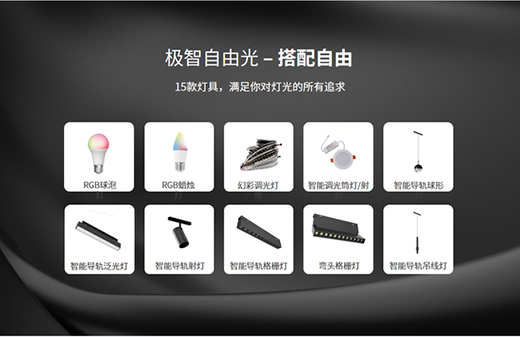 硬件端:共包含智能調光筒/射燈、智能導軌球形燈/泛光燈等15款產品,具備1600萬RGB色度, 2700-6000K色溫區間,擁有百階無極調光和精細深度調光,PWM信號控制,20kHZ 高頻,無頻閃現象。可實現近程的本地開關、情景面板及網關,中程的語音及APP遠程的多種控制方式,且任何燈都能自由建組,zigbee無線控制,高穩定性、低延時。