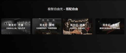 三是空間自由光:根據客廳、臥室、書房等不同功能空間區域,調節不同的燈光氛圍,打造歡快興奮的會客空間、浪漫溫馨的聚餐空間、寧靜專注的閱讀空間等多樣體驗模式;