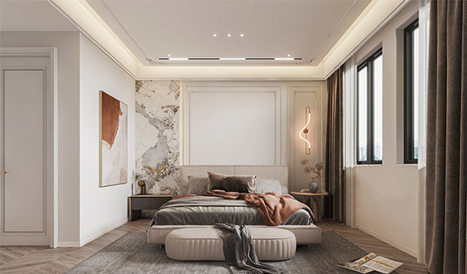 隨著材料與工藝的發展,無主燈設計的花樣也是越來越多,比如在墻面上條狀的嵌入燈槽,增加空間的光影效果;在背景墻的造型上加入燈帶、在柜體內嵌入燈帶等輔助光源的,具體可以根據空間整體搭配設計效果,來決定輔助光源的布置與設計。