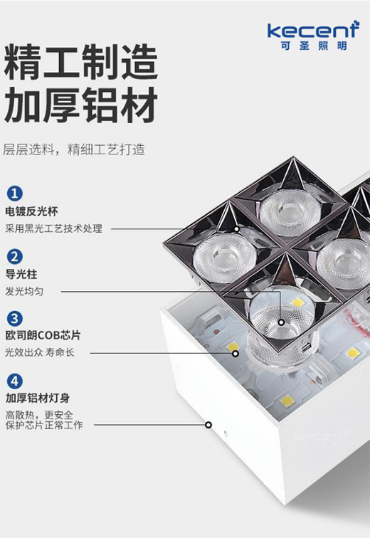 (1)KECENT可圣照明商城熱銷的這款明裝射燈產(chǎn)品,選料優(yōu)異,精工制造,在產(chǎn)品品質(zhì)上有突出的表現(xiàn)。該品采用優(yōu)質(zhì)柔光面罩及電鍍反光杯,出光精準(zhǔn),光斑干凈;選用行業(yè)知名的德國歐司朗COB芯片,顯色高,光效呈現(xiàn)效果佳;配上加厚鋁材燈體,外型美觀,高端大氣,且散熱性能好,使用更安全。