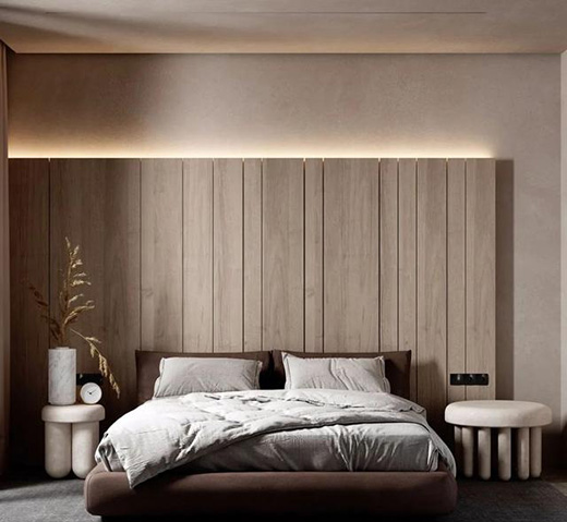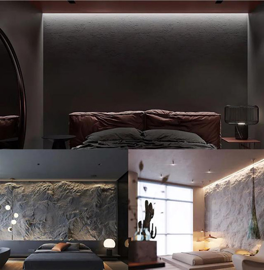 床頭不裝射燈,還可以用燈帶來做間接照明,一方面能夠起到裝點的作用,另一方面也能夠滿足日常的功能性照明,燈帶可以為臥室提供很好的氛圍感,對于一些大面積使用肌理造型的墻面來講,這種照明方式可以突出肌理層次感,防眩效果也是非常好的。間接光不僅可以安裝在天花上,還可以在墻面使用,比方說在床靠背后設置往上照射的燈帶,可以產生豐富的光源層次。除了床頭照明,燈帶還可以作為起夜燈,在床下設置一盞超低照度和色溫的感應燈帶,方便起夜使用。