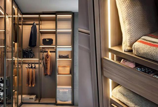 衣柜部分的照明也是我們重點關注的部分,主要分為內外兩個部分,在衣柜外面安裝射燈,能夠保證柜門打開以后,可以無死角去觀察衣柜內的物品,不過很多時候,為了看得更加清晰,我們都會建議在柜體的內部裝上感應燈帶,就像冰箱一樣,柜門打開自動亮光,柜門合上自動關閉,這樣在選擇和整理衣物時更加的方便。