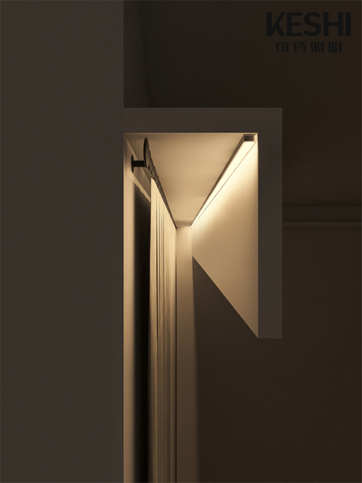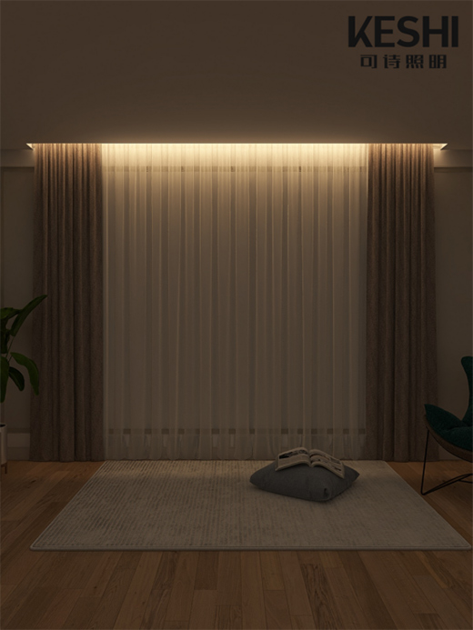 解決這個問題,KESHI可詩照明完全是毫無難度,只需要運用LED線條燈即可。選擇不同的線條燈及不同的安裝方式,還能呈現出不同的燈光效果。比如采用常規明裝款的LED線條燈向下打光,能讓窗簾呈現從上到下被擦亮的效果;安裝陰角款的LED線條燈,讓其45°傾斜出光,那窗簾就會出現上半部分亮、下半部分暗的質感;此外,安裝時讓LED線條燈側面出光或向上出光,也會呈現出不一樣的效果。