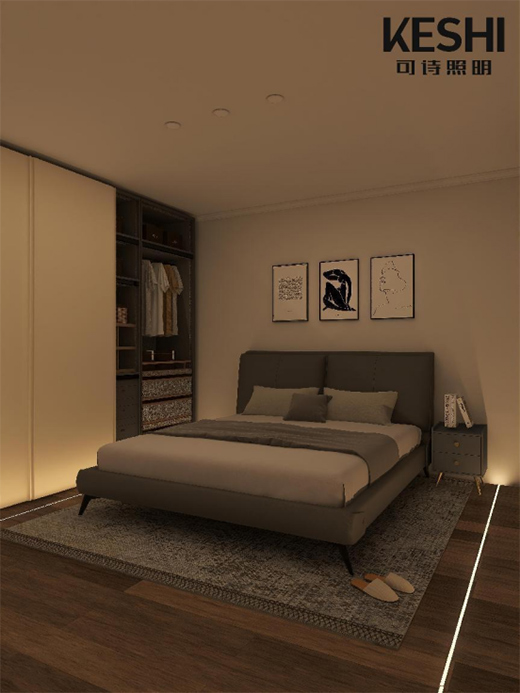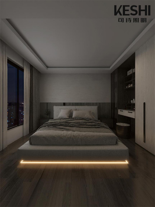 KESHI可詩照明告訴大家,其實只要在床圍或床邊安裝上地埋線性燈即可,這種產品采用加厚的燈罩燈槽制作而成,能承載的重力較大,即使任意踩踏它也不用擔心會變形。裝上它后不僅能增添房間的氛圍感,也能為我們的夜間起床提供便利,燈光不刺眼又能提供到夜間活動所需的亮度,安全感滿滿。
