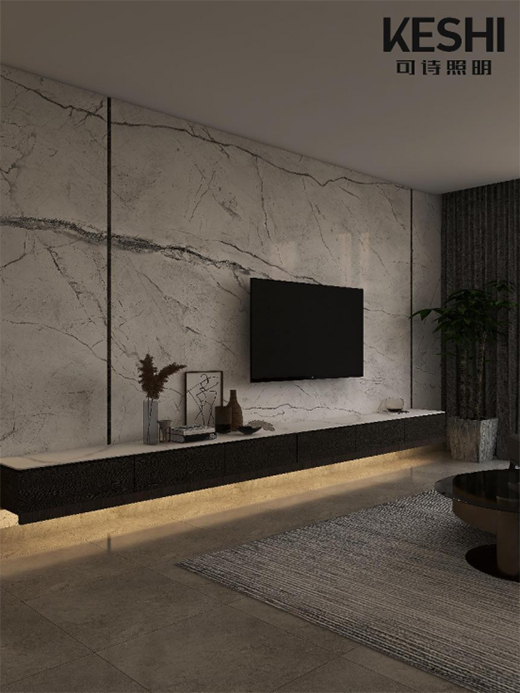 當然可以,懸浮電視柜只需要線條燈便可實現。這里給大家介紹兩種布燈方式供參考,第一,線條燈安裝在收口條或電視柜擋板位置,朝里面打光,出光柔和,既不會在地面顯示出線條燈的形狀,也不會放大地面的灰塵,一舉多得。第二種,同樣是裝在收口條或電視柜擋板位置,但選擇45°向里出光,同樣出光柔和,輕松營造出懸浮柜效果。家中有了懸浮柜,當然不必擔心居室環境會沉悶啦!