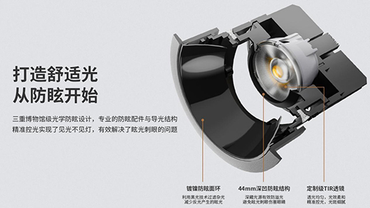 ES52射燈防眩指數UGR小于13趨近專業級標準,以44mm筒深藏住光源避免直射刺眼,配置鍍鎳防眩環有效吸取眩光雜光,搭配特定制光學級TIR菱格紋透鏡,使出光均勻柔亮不刺眼。實現“見光不見燈”防眩效果。