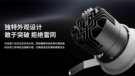 另外,其簡練硬朗的外觀線條、對稱式的立體迷宮散熱造型,加之科技感十足的太空灰配色,使辨識度極高,功能與美感兼具,體現出燈光設計師的用心。