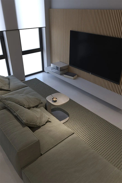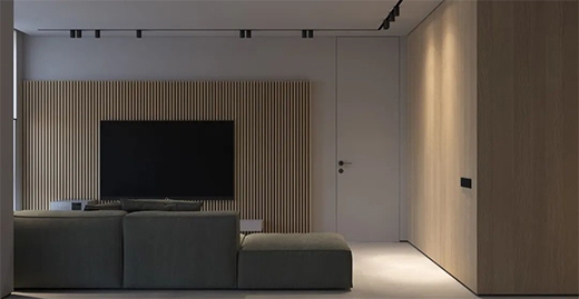 客廳空間不大,沒有過多的裝飾,電視面做木柵欄,加空間的適度留白,造就了極簡中的質感。
