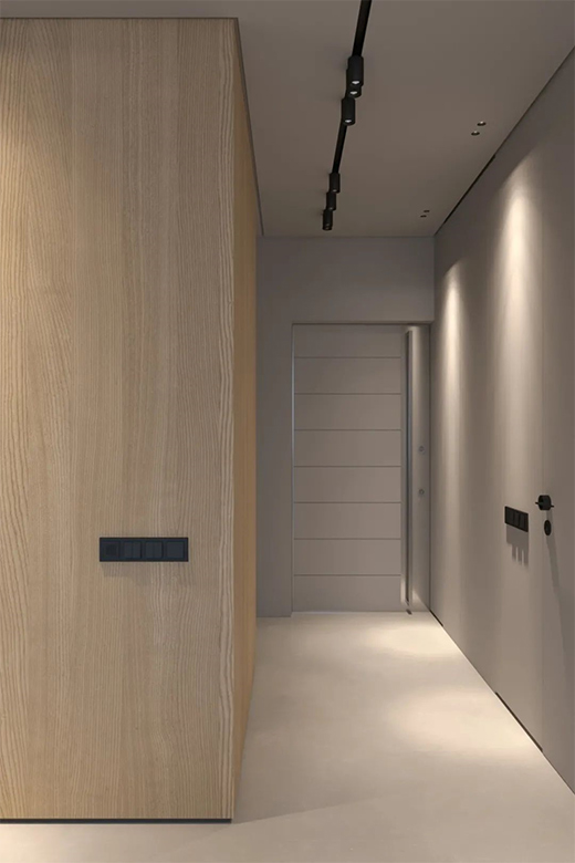 一進家門就感受到了強烈的現代極簡風格氣息,沒有過多的復雜元素,墻、頂、地面表現得非常簡潔利索。結合統一的設計語言和材料的連續性,營造出強烈的空間體驗。