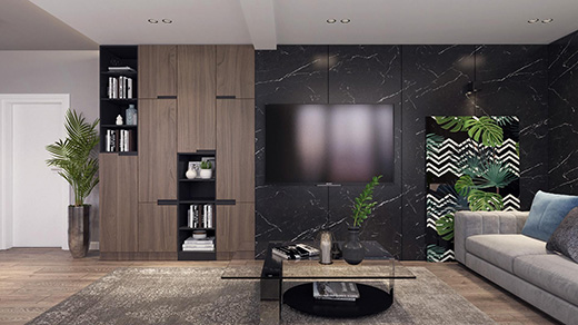 客廳吊頂采用白色乳膠漆進行通刷設計,讓頂部看起來更為整潔美觀,整體采用無主燈的設計,讓客廳上下更為敞亮。整個客廳是一個矩形的大通透空間,在沙發側邊采用圓形筒燈作為補光設施,黑色的電視背景墻邊是陳列柜,這是一處客廳設計亮點,框架感讓客廳更具時尚性。