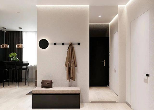 玄關作為室內外的一個緩沖區,空間比較狹小,在燈光上可以選擇筒燈、射燈、燈帶,在鞋柜上做感應式燈帶給晚歸的人提供一個方便的照明。
