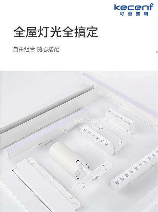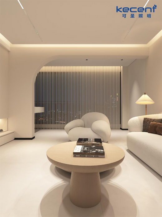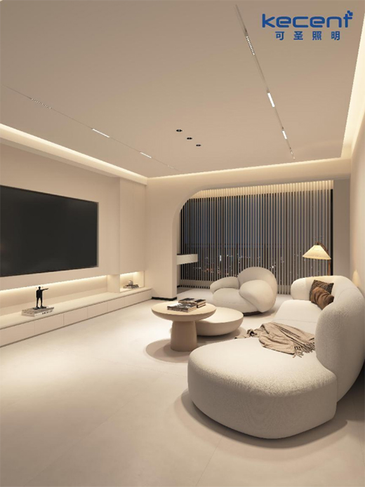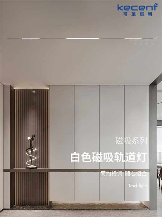 這里提個題外話,市面上銷售的大部分磁吸軌道燈的外觀顏色都為黑色,這與這個方案中整體偏向米色系的家居風格明顯不符,若強行應用上黑色的磁吸軌道燈未免過于突兀。但恰巧的是,KECENT可圣照明正有售賣外觀為白色的磁吸軌道燈,產品顏色能很好地與這個案例的空間色彩相融合,成功達到業主的高審美要求。