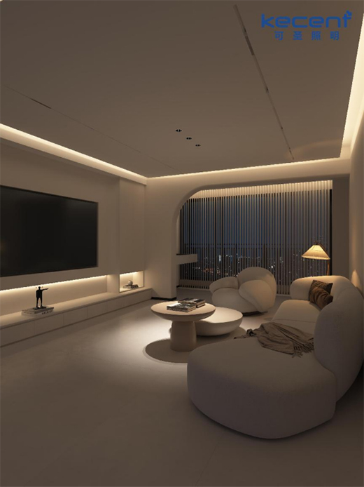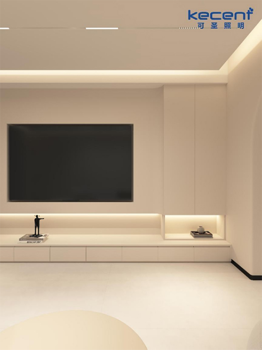 KECENT可圣照明燈光設計團隊在處理這個方案時,非常謹慎地將業主的實際需求及生活日常習慣放在首要考慮位置。在斟酌客廳燈光設計時,考慮到業主有收藏藝術品擺件的興趣愛好,于是給電視柜做了巧妙的燈光氛圍處理,特意安裝上線條燈點亮這個小區域,趕走昏暗與壓抑,讓這里一躍成為藝術收藏品展區。