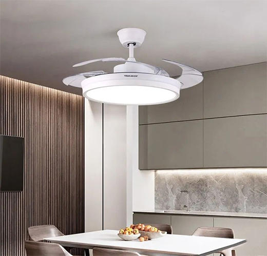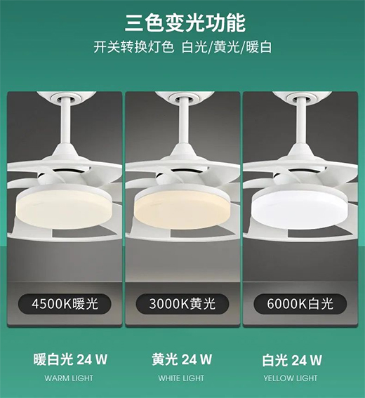 選擇光源具有三段變光功能的佑家風(fēng)扇燈,燈具采用三色光源:黃光,暖光,白光。根據(jù)生活需求調(diào)整光源顏色,隨心選擇。