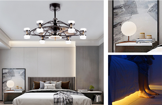 為了方便睡前看手機,可以安裝小臺燈;為了睡前閱讀,可以使用風(fēng)扇燈的照明;為了起夜方便,可以安裝床下感應(yīng)燈線!