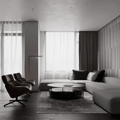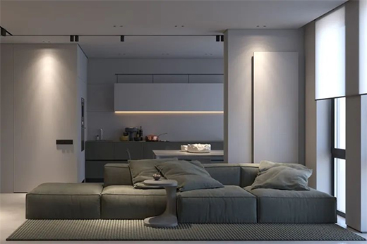 比如由Z.Design事務所設計的打造的這個公寓,設計師為凸顯客廳的舒適愜意,就把重點光照用在了沙發(fā)及其周邊休閑區(qū)域。
