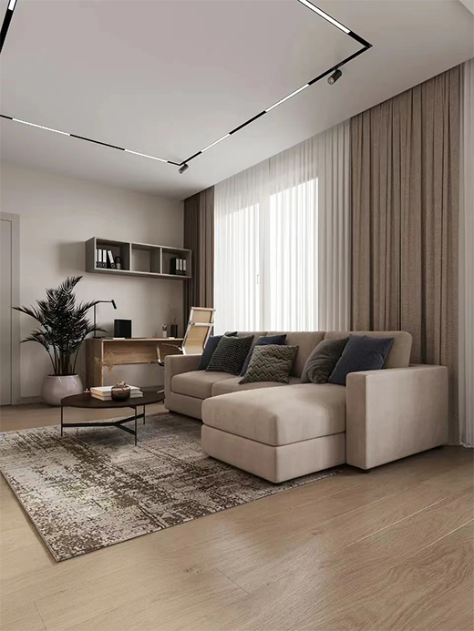 客廳常用于觀影、會客以及日常休息,因此重點區(qū)域便在于過道、沙發(fā)以及電視區(qū)域。