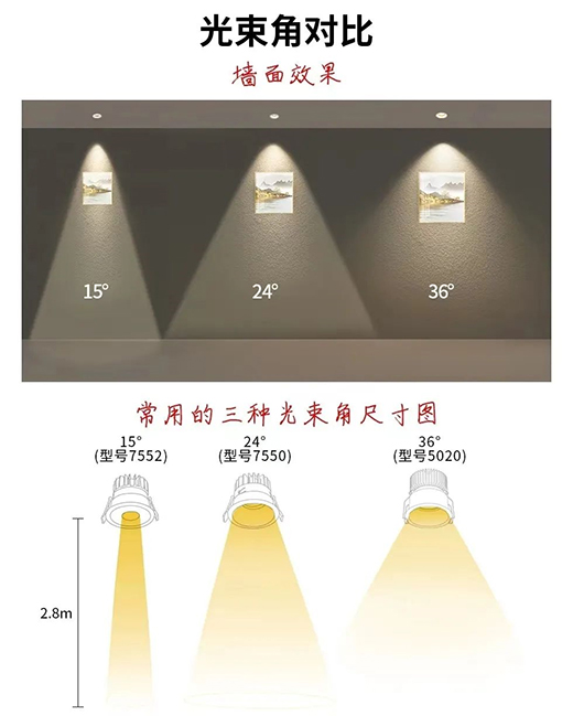 ? 選擇合適光束角的燈飾:同一光源光束角越大中心光斑越小,光源越柔和,光束角越小中心光斑越強,光源越生硬。常見筒燈射燈的光束角范圍在10°~60°,吸頂燈的光束角為140°左右,家居空間最常用到的是24°光束角。