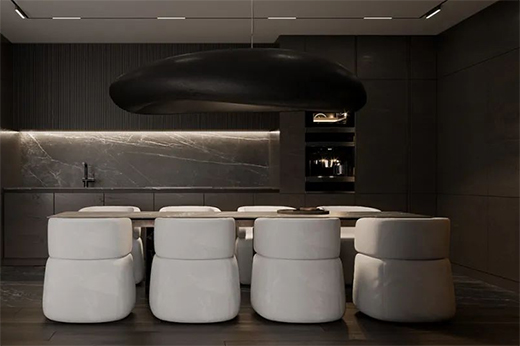 此外,以無主燈設計為基礎,添置一盞合適的燈飾,可以讓整體空間的實用性和裝飾性大大增強。像這個餐桌上方的吊燈也是餐廳設計的一大亮點,具設計感的大面積吊燈不僅與餐廳純黑色調(diào)相得益彰,也讓餐桌區(qū)域有了補充光源,讓就餐更舒適。