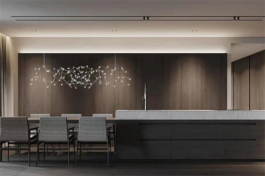 廚房照明使用無主燈設計,應更重視實用,其次再考慮美觀。要考慮到做菜的便利性,因此,燈具需軌道燈+操作臺燈帶+柜內(nèi)燈+踢腳燈多種組合,軌道燈負責主要光源,其他幾個燈光各司其職,做到所到之處都能被燈光包圍,不留一點陰影。