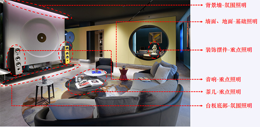 有主燈空間整體明亮,但無(wú)法切換格調(diào)及生活情景,無(wú)主動(dòng)空間整體暗,但可根據(jù)需要控制各區(qū)域的燈光變化。