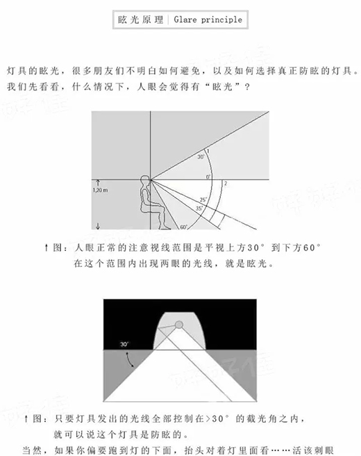 眩光簡(jiǎn)單的來(lái)說(shuō)就是會(huì)刺眼的光線,會(huì)讓人感覺到不舒服的光線,就算是再深防眩光的射燈,在射燈正下方也一樣會(huì)有眩光,在設(shè)計(jì)燈光的時(shí)候,所有射燈的光線都要經(jīng)過(guò)設(shè)計(jì),不能直射。