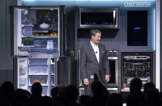 資料圖:在美國拉斯韋加斯,三星美國公司副總裁約翰·赫林頓展示冰箱、洗衣機(jī)等新產(chǎn)品。