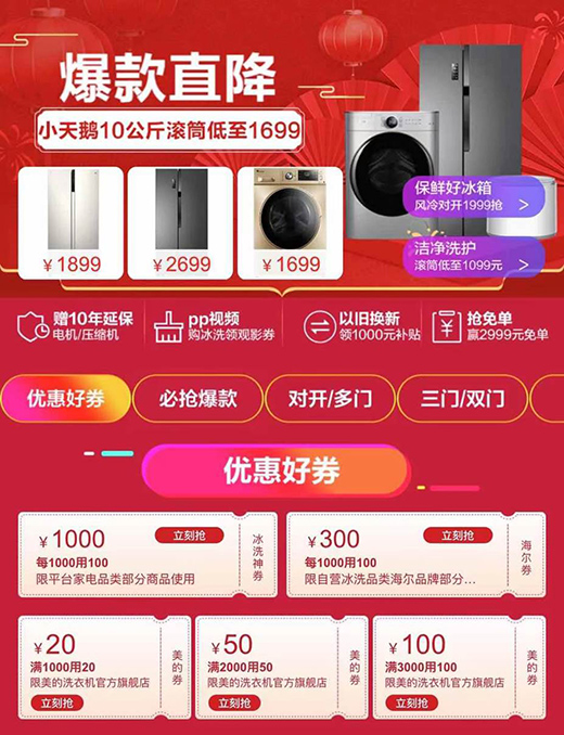 據了解,本次活動中,冰箱熱銷款西門子610升風冷對開門大冰箱將再現好價,到手低至5099,美菱632升雙變頻保鮮對開門冰箱僅售2999元;另外,由于對健康需求專注度激增,備受歡迎的除菌洗衣機,如小天鵝10公斤99.9%健康除菌滾筒洗衣機活動價限時1699;海爾10公斤殺菌除螨洗烘一體機更是低至2599元。