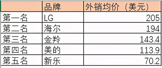 從TOP5品牌來(lái)看,LG均價(jià)最高是205美元,海爾以均價(jià)194美元居第二,第三名為美的113.9美元,而新樂(lè)僅為70.2美元。
