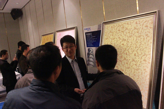 客戶對(duì)新產(chǎn)品興趣濃厚,圖為巴德士漆推廣部經(jīng)理陳少豪在會(huì)后為客戶講解巴德士藝術(shù)涂料。