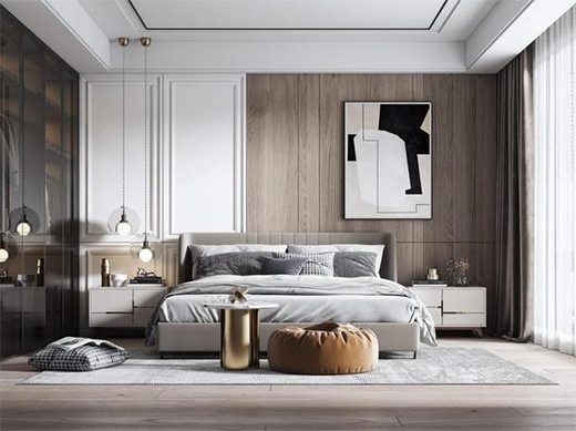 床頭墻與沙發墻一樣作為靠放大件家具的墻面,換成木質感的就顯得更加厚實穩重,自然舒適的木材質感,也能讓空間顯得更加精致舒適,提升臥室空間的溫馨情趣。