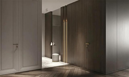 玄關區域迎來送往,起到隔絕室外保護室內私密性的作用,木飾面玄關墻面給人以溫暖的視覺感受,傳遞出自然溫馨的家庭氛圍,同時耐臟易打理,保持玄關的檔次和氣質。