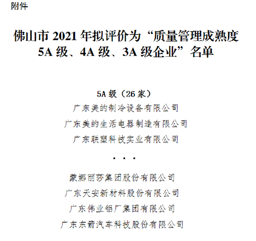 近日,佛山市2021年企業質量管理成熟度評價結果公示,全市共有92家企業上榜,廣東偉業鋁廠集團有限公司位列其中,獲評“佛山市2021年企業管理成熟度5A級企業”。