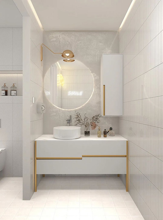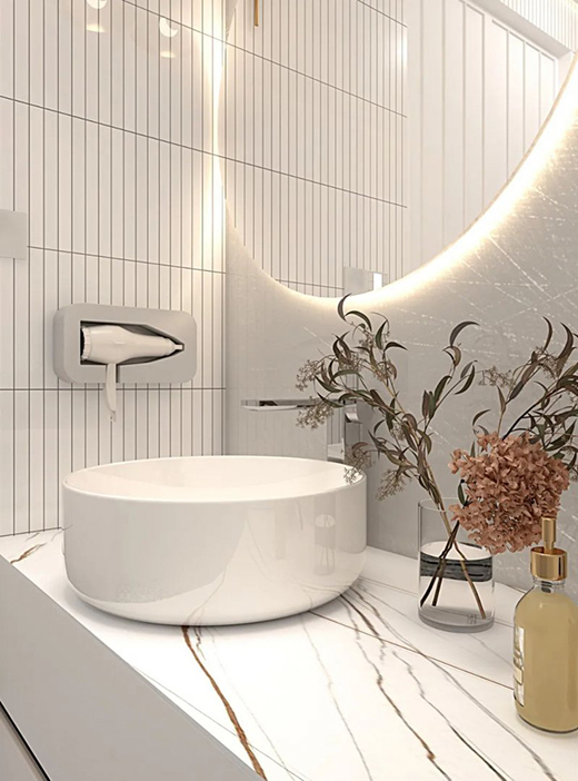 圓形臺上盆搭配方形巖板臺面,將“天圓地方“的自然平衡之感帶入衛(wèi)浴間,是顏控福音。