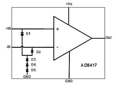 圖 2 顯示了一個具有類似二極管配置的放大器,但在這種情況下,電流受到內(nèi)部 2.2kΩ 串聯(lián)電阻的限制。這與圖 1 所示電路的不同之處不僅在于限制 R 的值,而且還在于 2.2kΩ 可防止電壓高于 +Vs。這是使用 ESD 二極管時必須充分理解以優(yōu)化保護的復雜性示例。